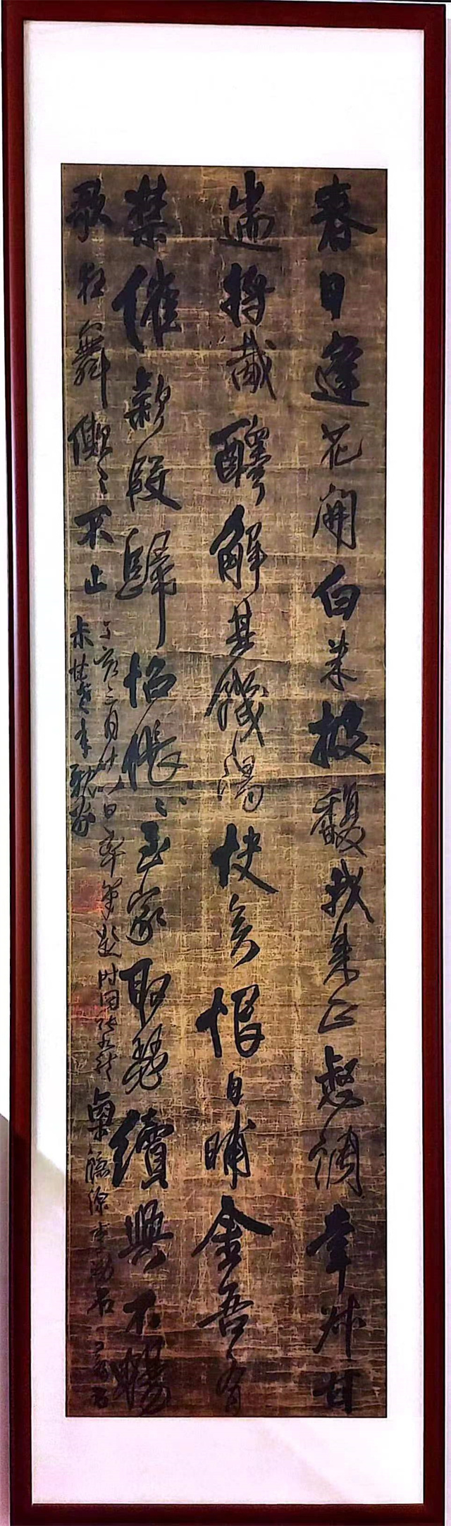 王铎(1592-1652),字觉斯,号嵩樵, 孟津(今河南孟津)人。好古博学,诗文书画皆有成就,尤其书法独具特色,世称“神笔王铎”。此幅行草立轴之书法用笔,出规入矩,张弛有度,充满流转自如,力道千钧的力量。