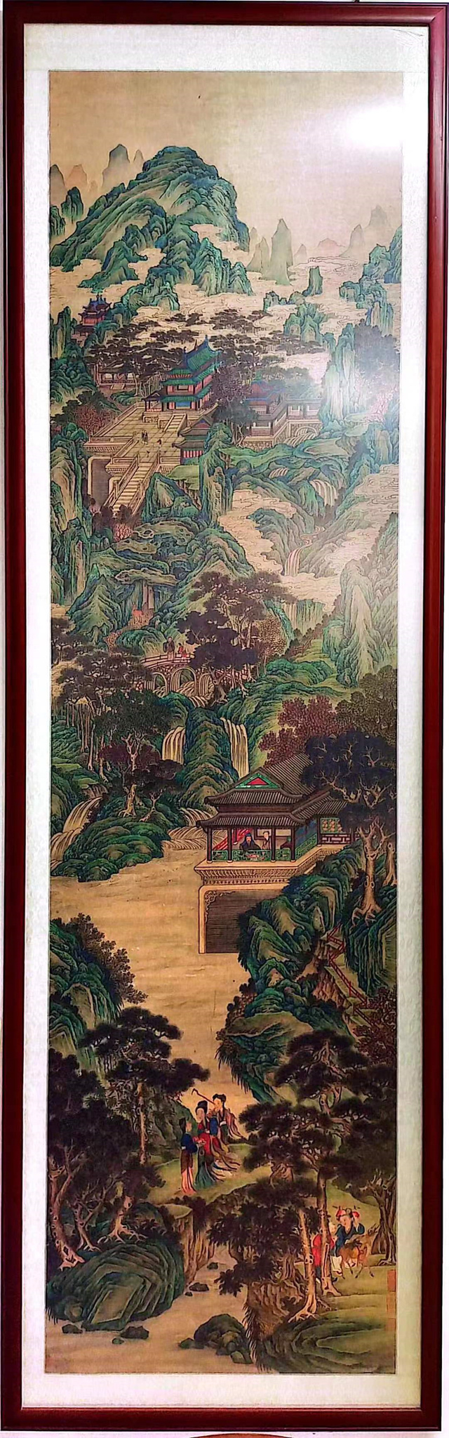 此幅青绿山水卷轴,为明代佚名画家所做,上钤“智者乐”印文,所绘近景行人乐游山水之间,远处峰峦叠翠,宫殿密布,云气弥漫,画面整体形神兼备、气韵生动。