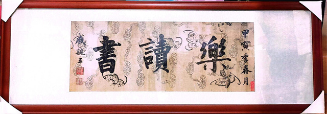 “乐读书”题字仿真品为成哲亲王永瑆所题。爱新觉罗·永瑆,号少厂,清高宗乾隆帝第十一子,清朝著名书法家。“乐读书”用笔俊逸,结体疏朗,风格典雅,有喜好读书,以读书为乐之意。我国自古便有“乐读书、正品行”“四时读书乐”“为善最乐、读书便佳”等论述读书乐趣之言。此幅“乐读书”题字彰显了古人对于读书乐趣和情调的追求,更含有宣扬读书的高雅情趣,勉励人们清风读书的意味。