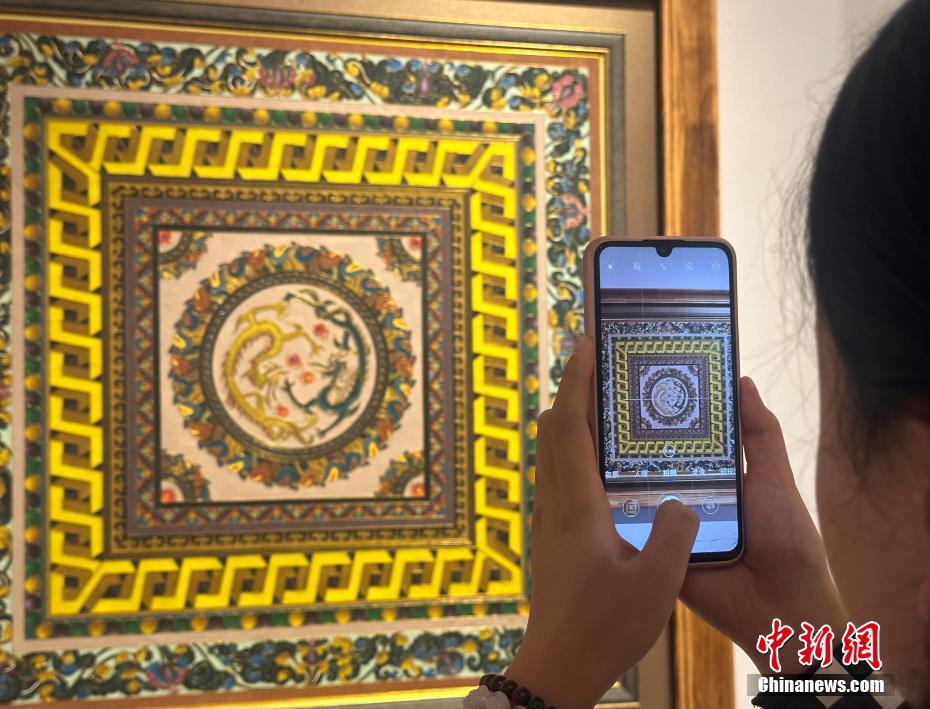 金丝线条勾勒出清晰轮廓,色泽鲜艳的珐琅填充其间……用细如发丝的掐丝珐琅呈现出敦煌壁画中的“龙元素”,技艺精湛,流光溢彩。1月5日,在甘肃省掐丝珐琅壁画代表性传承人李海明的作品展览中,共展出二百余件精美作品,题材涵盖敦煌壁画、藻井图案、文创产品等。其中不少以龙元素为主题的掐丝珐琅画,颇为引人注目。题材都是选自于莫高窟壁画中现存原型图案,进行复刻并加以创作。一幅幅大尺寸的敦煌掐丝珐琅画花纹繁复、色泽鲜艳、流光溢彩。图为现场观众用手机拍下带有龙元素的掐丝珐琅画。高莹 摄
