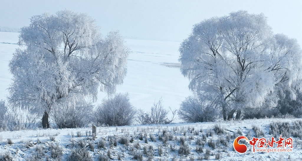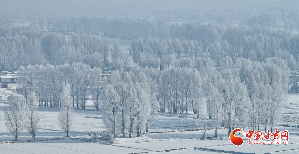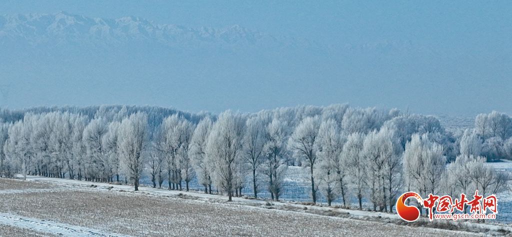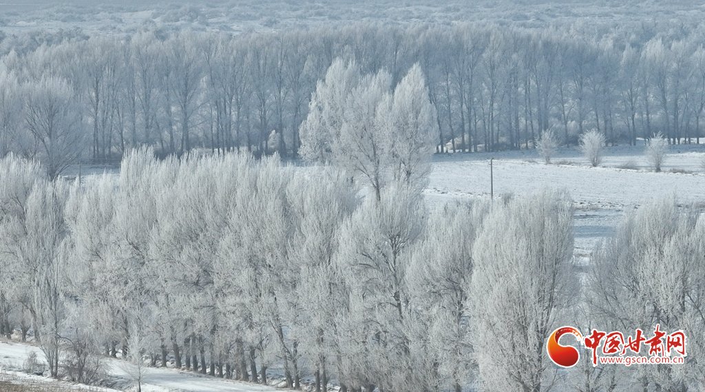 受寒潮侵袭,甘肃张掖近日迎来大范围降雪,立春之日,高台县南华镇一带迎来大面积雾凇树挂景观,遍野树木晶莹洁白,宛如琼树银花,呈现出一幅壮美北国风光。