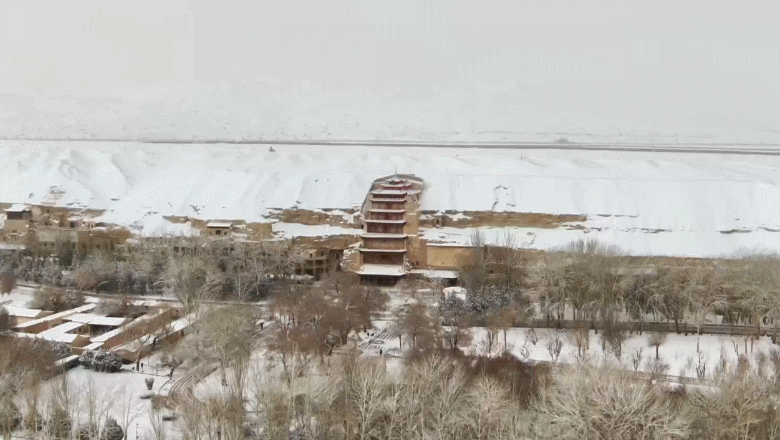 2月17日,敦煌市迎来立春后的第一场大雪,世界文化遗产莫高窟被皑皑白雪覆盖,变成了银装素裹的冰雪世界,为游客带来了惊喜,也为春天增添了一丝浪漫。