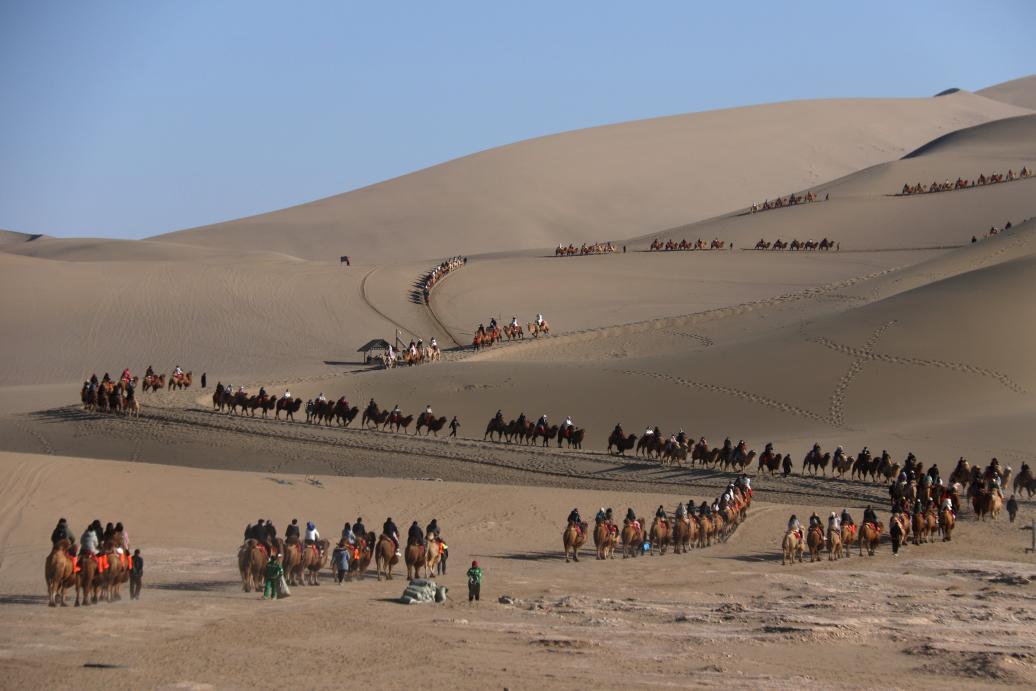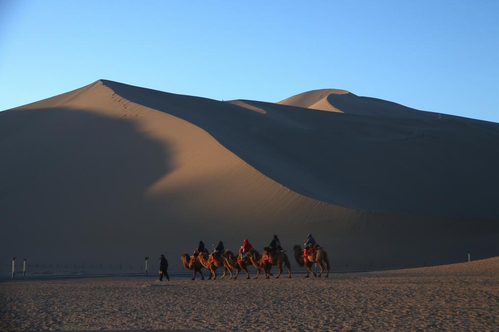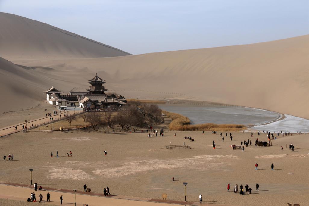 2024年2月10日,游客在甘肃省敦煌市鸣沙山月牙泉景区游览。