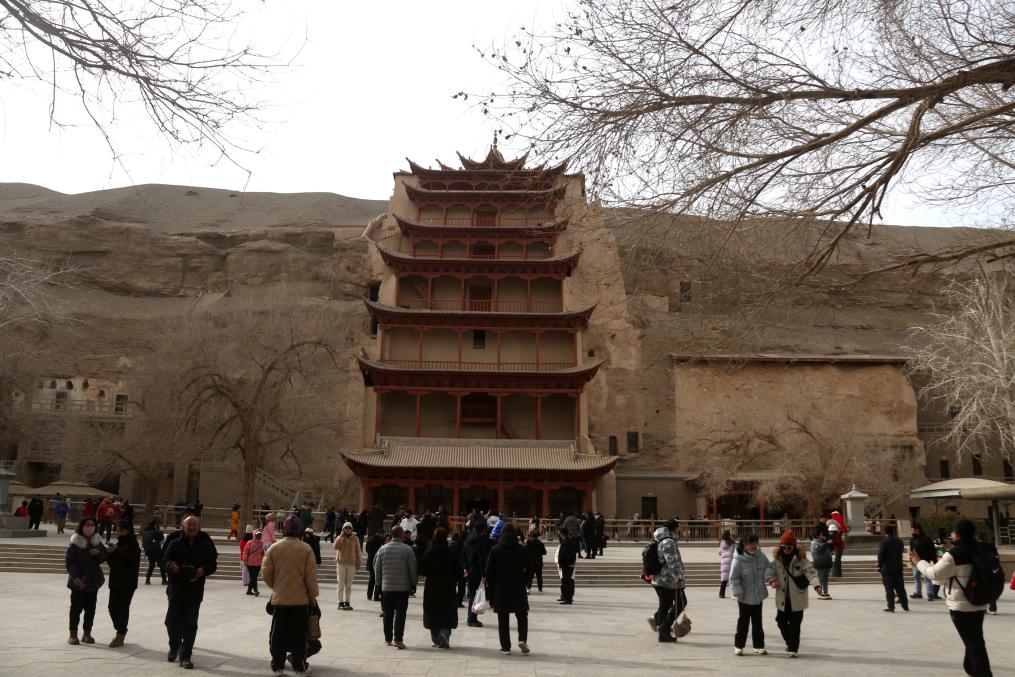 2024年2月13日,游客在世界文化遗产敦煌莫高窟参观。