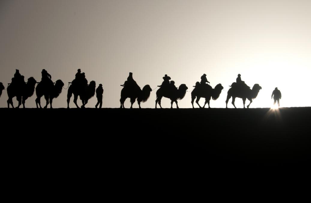2024年2月14日,游客在甘肃省敦煌市鸣沙山月牙泉景区游览。
