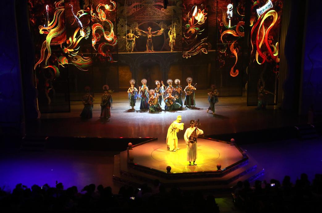 2024年2月15日晚,游客在观看大型洞窟式沉浸体验剧《乐动敦煌》。