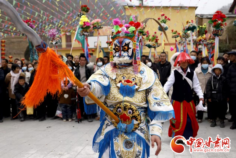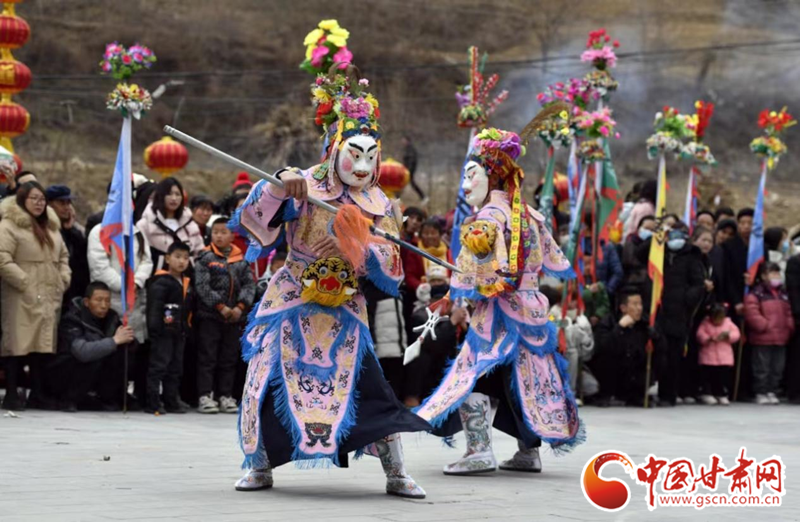 2024年2月19日,甘肃省陇南市武都区鱼龙镇柏家沟村,村民在表演当地特色剧种、国家级非物质文化遗产——高山戏。