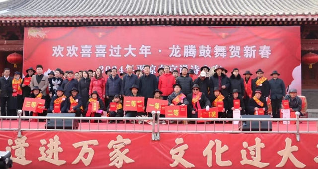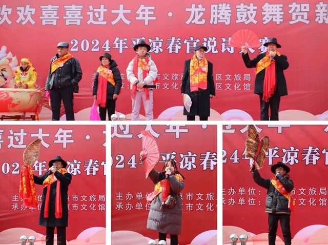 锣鼓喧天声激昂,春官说诗赞家乡。生活全面奔小康,高举酒杯情满腔。2月24日,2024年平凉市春官说诗大赛在平凉市文化馆泾水欢歌百姓大舞台圆满举办,活动的主题是“欢欢喜喜过大年·龙腾鼓舞贺新春”暨“非遗过大年·文化进万家”,本次活动由平凉市文化广电和旅游局、崆峒区文体广电和旅游局主办,平凉市文化馆、崆峒区文化馆承办,邀请全市知名春官和非遗文化骨干担任评委。