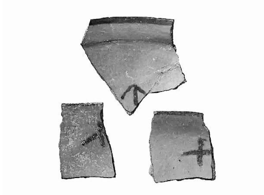 展厅还陈列有大地湾文化的彩绘符号,绘在钵形器残片的内壁上。红彩、连续性不强或单独个体的符号,介于图画和文字之间,种类有13种之多。这些符号已非单纯的装饰图案,有些很明显的是具有记事或表达某种意义的符号。大体可分两类,一类是形似植物的符号,另一类是以直线或曲线构成的符号。在仰韶早期彩陶钵的宽带纹上,也发现类似的刻画符号,两者应该有着密切联系,这无疑为文字起源研究提供了重要资料和线索。郭沫若先生曾说“彩陶上的那些刻画符号,可以肯定地说是中国文字的起源,或是中国原始文字的孑遗”。
