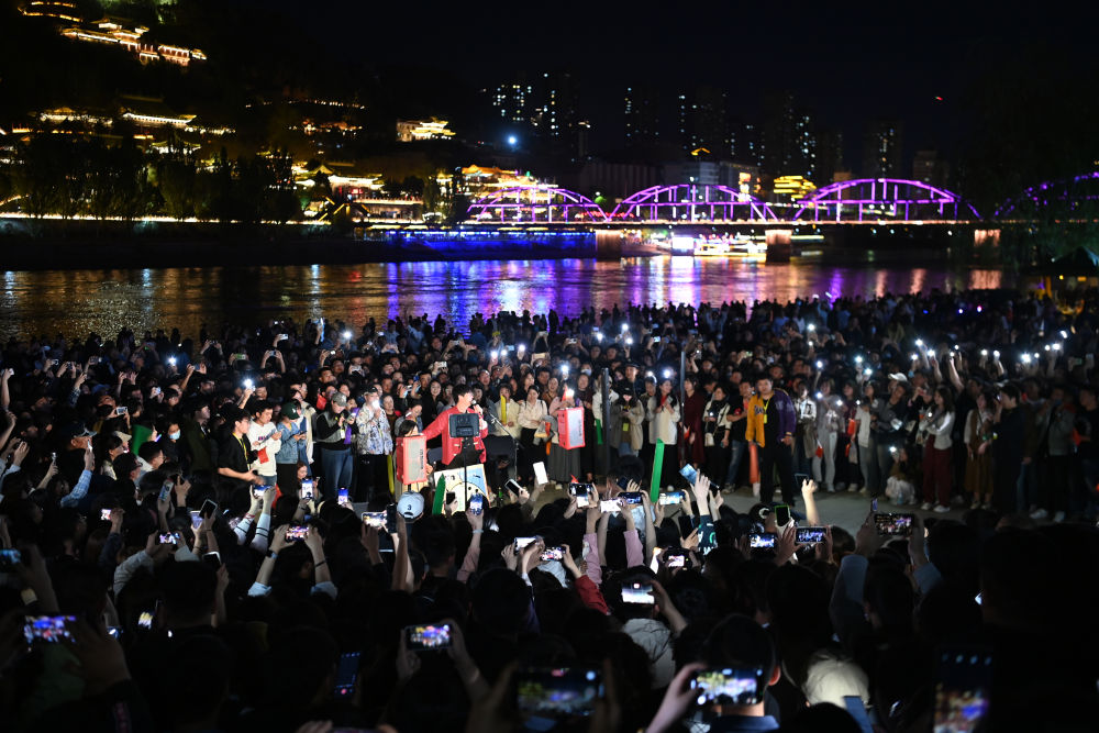 4月26日,游客在兰州黄河食渡文旅美食街观看演出。新华社记者 郎兵兵 摄
