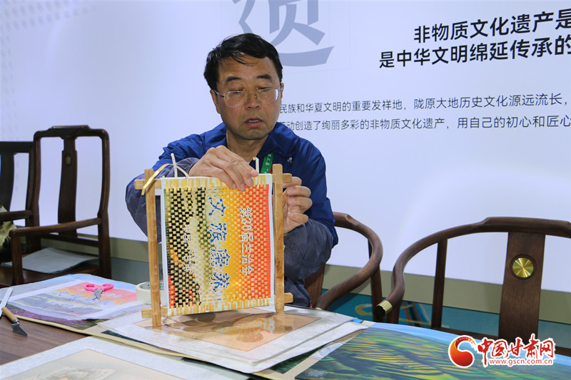 在第三十届兰洽会平凉馆内,非遗传承人魏巍正坐在桌前制作着泥金纸织画。巧手之下,金色的“纬线”交织于“经线”之间,经纬交错,乾坤自成。