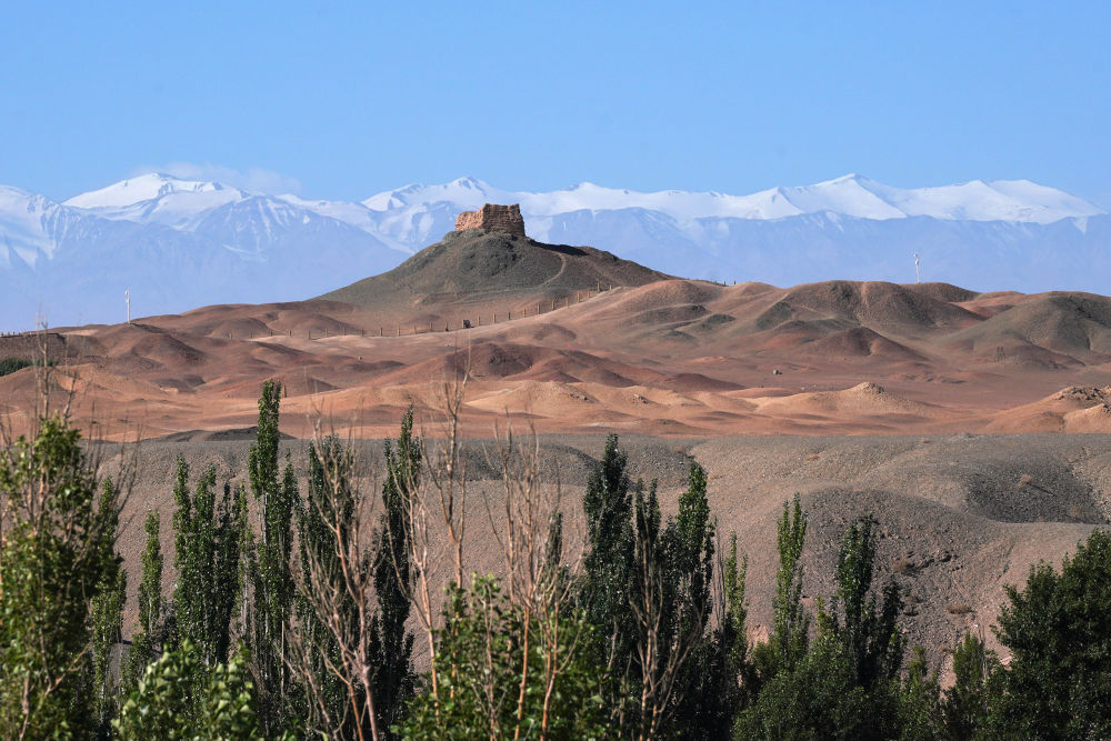7月16日在甘肃省敦煌市拍摄的阳关烽燧和远处的雪山。新华社记者 马宁 摄