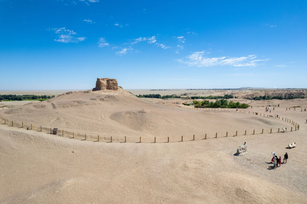 7月17日,游客在甘肃省敦煌市阳关景区参观游览(无人机照片)。新华社记者 郎兵兵 摄
