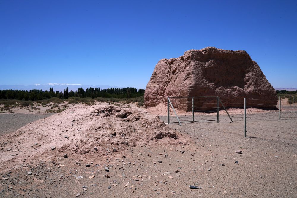 7月17日,在甘肃省敦煌市阳关景区附近拍摄的山水沟大墩烽燧和积薪遗址。新华社记者 马宁 摄