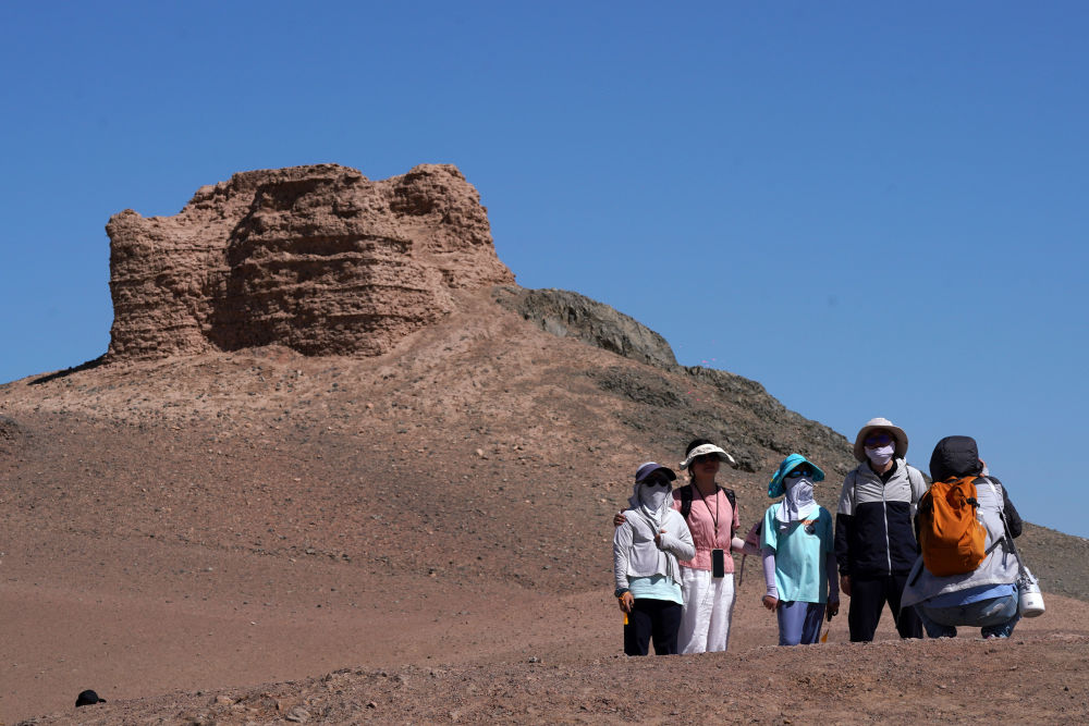 7月16日,游客在甘肃省敦煌市阳关景区内的阳关烽燧旁参观游览。新华社记者 马宁 摄