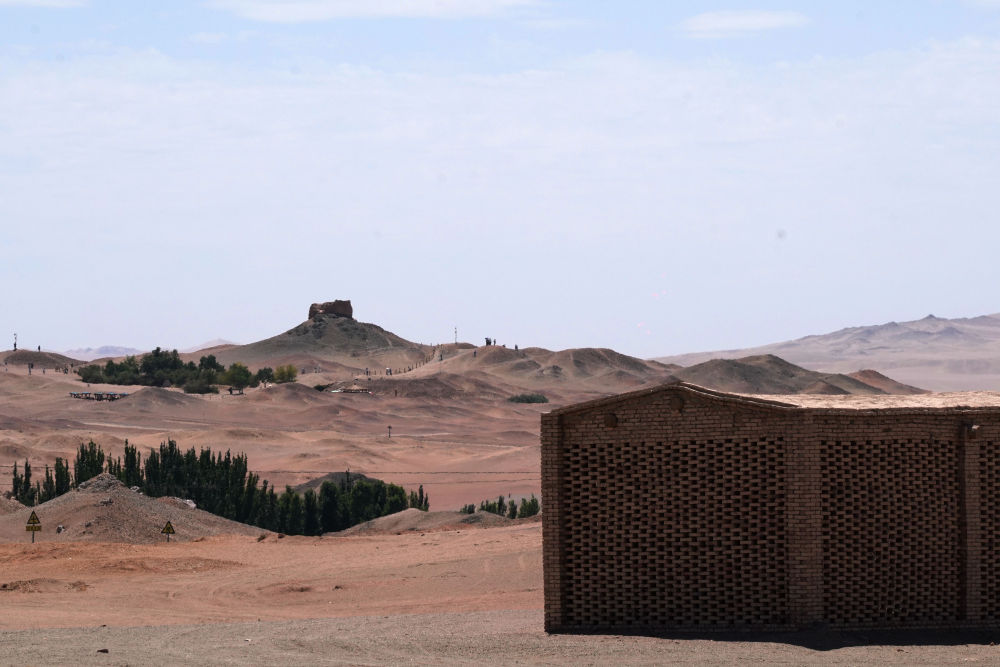 8月2日,游客在甘肃省敦煌市阳关景区内的阳关烽燧旁参观游览。新华社发(张晓亮 摄)