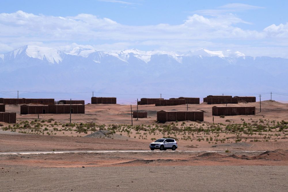 7月17日,在甘肃省敦煌市阳关景区附近,一辆汽车从葡萄晾房旁驶过。新华社记者 马宁 摄