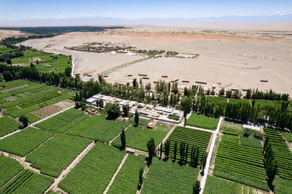 7月18日在甘肃省敦煌市拍摄的阳关景区和附近绿洲(无人机照片)。新华社记者 郎兵兵 摄