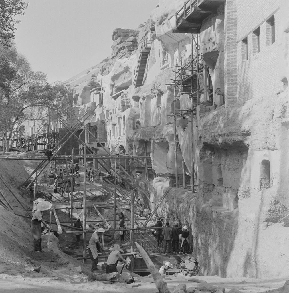 敦煌研究院工作人员对莫高窟部分洞窟进行加固施工(1964年7月8日摄)。(敦煌研究院供图)