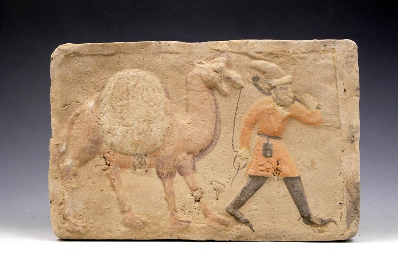 模印彩绘胡商牵驼画像砖,砖面呈长方形,模印彩绘胡商,深目高鼻,头戴尖顶毡帽,身穿红色窄袖紧身胡服,腰系黑带,挂黑色烟荷包,足蹬长筒黑靴,脚尖上翘,一手揽缰牵驼,一手持骨朵扛肩,大步前进,身后骆驼背部驮架上搭载驮囊,体型浑圆,四肢健捷,背负重驮,阔步前行,张嘴嘶鸣。真实地再现了在当年的河西走廊丝路贸易通道上,来自西域各国的商人们组成运载丝绸等货物的骆驼商队,不畏艰险,日夜兼程,在叮铛的驼铃中行进在戈壁、绿洲、沙漠、河道中的情景,像一帧帧带着历史风霜的“老照片”,重现了这个商贸重镇千年前的繁盛与活力。