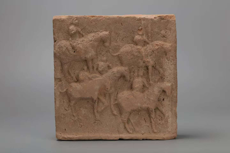 模印骑马武士图墓砖和牵马图墓砖上刻画的武士穿着服饰特征十分清晰,幞头顶部高耸,窄袖胡服,呈现出很强的时代特色,雕刻的马匹,马首各具姿态、马颈弧度优美、胸肌健峻、臀部圆硕、腿蹄腱张,与武士相得益彰,使整个砖面充满鲜活之气。人和动物比例协调,构图细腻,错落有致,构思巧妙,简单的一幅图案就把骑士们奔波于丝路,长途跋涉,风尘仆仆的情景栩栩如生的刻画了出来。
