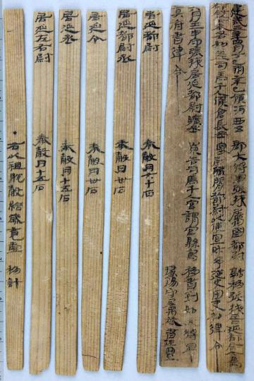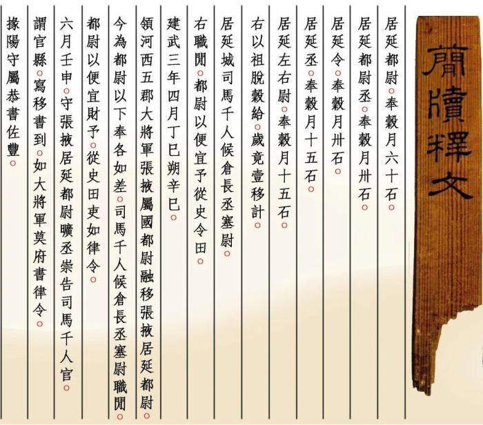 “建武三年四月丁巳朔辛巳,领河西五郡大将军张掖属国都尉融移张掖居延都尉,今为都尉以下奉各如差,司马千人候仓长丞塞尉职闲,都尉以便宜财予,从史田吏如律令……”出土于内蒙古额济纳旗甲渠候官遗址的《建武三年居延都尉吏奉例》由10枚简组成,每简长22.8厘米,前两简宽2.5厘米、其余8简宽1.4厘米,全文200字。