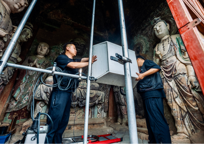 目前,麦积山石窟依托物联网、云计算、大数据等前沿技术,建立了文物风险监测预警体系,二氧化碳、土壤温度、岩体裂隙和光照等都有专用测试仪,确保第一时间能够发现并处置潜在风险,极大提升了麦积山石窟的风险管控能力。