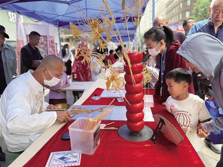 活动现场,30多项非遗代表性项目通过实物陈列、技艺演示、互动体验等形式,立体呈现黄河文化滋养下的金城记忆。从高亢激昂的兰州鼓子、巧夺天工的刻葫芦技艺,到风味独特的牛肉拉面制作技艺、充满民俗智慧的榆中古建筑模型制作技艺,无不引人驻足。