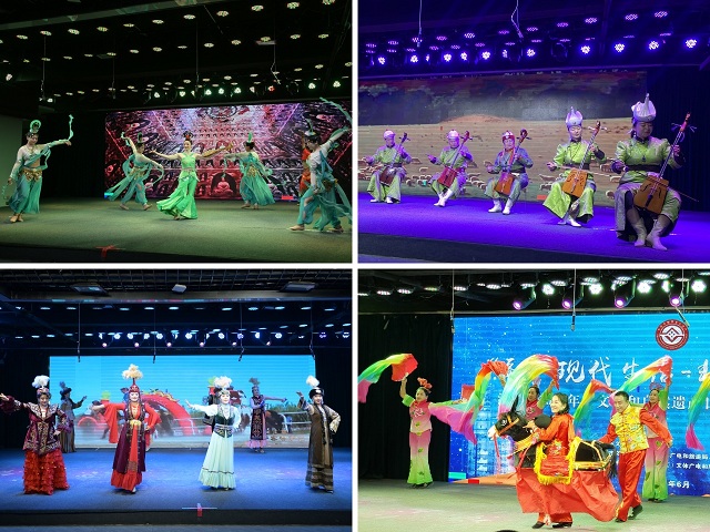 当晚,非遗特色节目展演在酒泉市文化馆3楼剧场精彩上演。以剪刀裁出万千气象,红纸晕染岁月华光,传统剪纸与时尚服饰碰撞出独特火花的剪纸服装秀《剪云裳》、借悠扬韵律道尽酒泉古道的金戈铁马与诗意柔情的肃州弹唱《塞上行》、让千年壁画中的飞天翩然起舞,再现丝路华章的敦煌舞《伎乐天》、蒙古族民歌服饰秀《草原蒙韵》、眉户戏《焦裕禄》、陶埙独奏《横塘烟雨》等14个节目轮番登场,从哈萨克族舞蹈《黑走马》的刚柔并济,到传统武术《春秋大刀、蒲团棍》的刀光棍影,全方位展现了酒泉非遗的多元魅力。