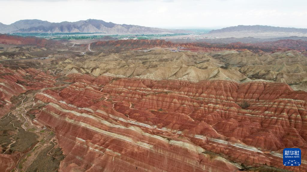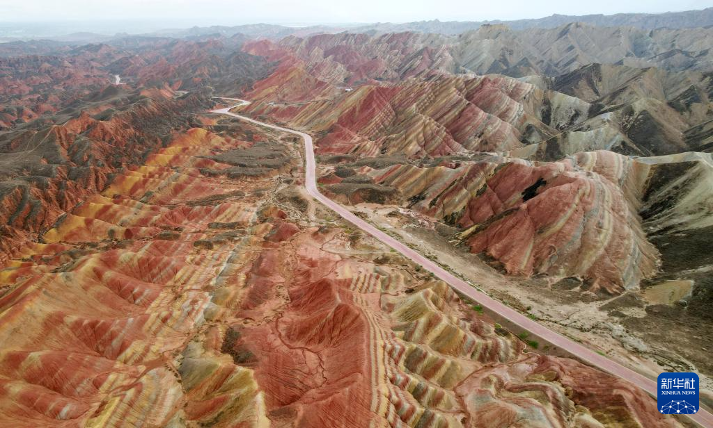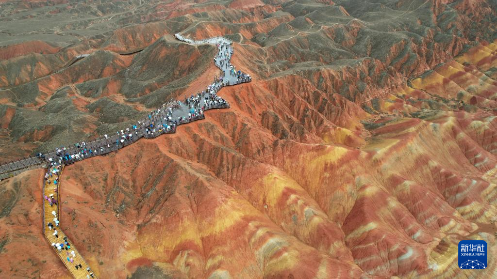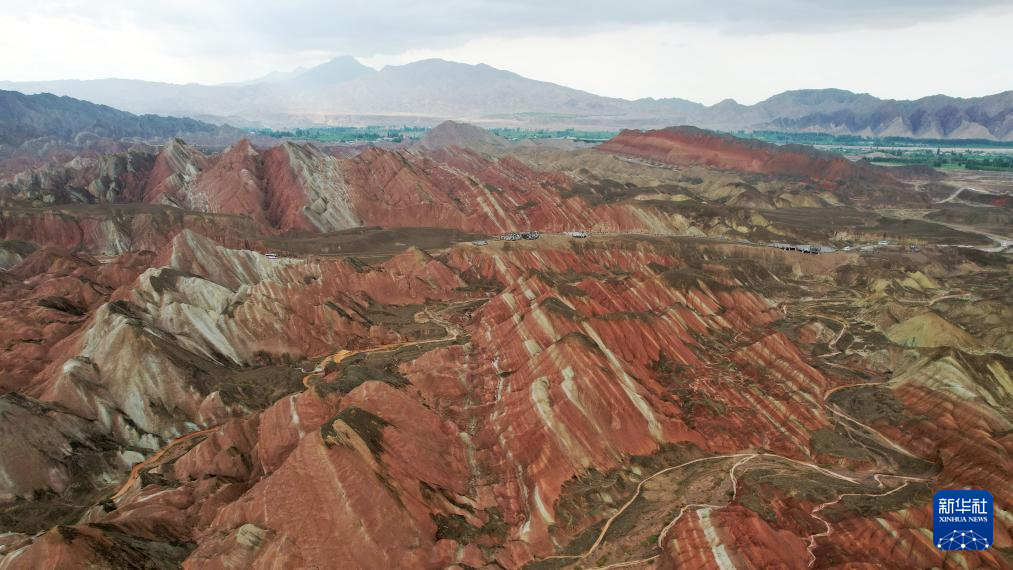 游客在张掖市七彩丹霞景区观赏雨中丹霞(6月22日摄,无人机照片)。新华社记者 陈斌 摄