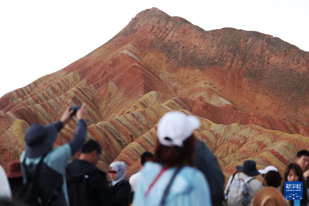 游客在张掖市七彩丹霞景区观赏雨中丹霞(6月22日摄)。新华社记者 陈斌 摄