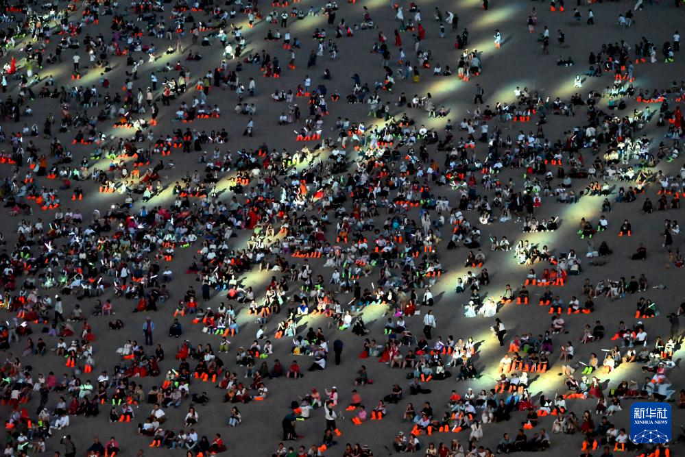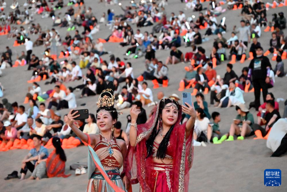6月20日晚,游客参加鸣沙山月牙泉星空演唱活动。新华社发(张晓亮 摄)