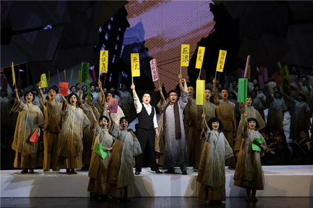 当指挥棒划破暮色,多媒体画卷泼墨般展开:黄河惊涛化作五线谱上的汹涌音符,光影交织间,聂耳创作手稿如星火漫天飞舞。该剧主舞台背景以多层次模块化设计形成了向心而聚的强烈视觉吸引力,使得舞台空间与历史空间深度契合,让观众更能切身感受到聂耳的热情、挣扎、希望与执着。随着演出行进至最动人心弦的终章,血色锁链的投影在舞台中央寸寸迸裂,“聂耳”转身将泛黄的《义勇军进行曲》手稿递向指挥台,“请全体起立”的字幕刺破黑暗,台上演员眼含热泪引吭高歌,台下观众肃立合唱。这一刻,剧场变成了一个巨大的共鸣场,每个观众都深刻感受到自己是这个伟大民族的一员,自己的心跳与祖国的心跳同频共振。这比任何说教都更能让“爱国”二字变得具体、真切、热血沸腾。
