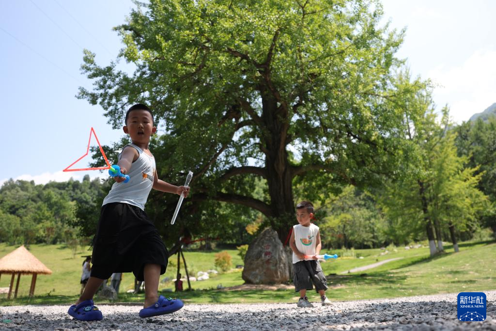 孩子们在田河村的千年银杏树下玩耍(7月15日摄)。新华社记者 陈斌 摄