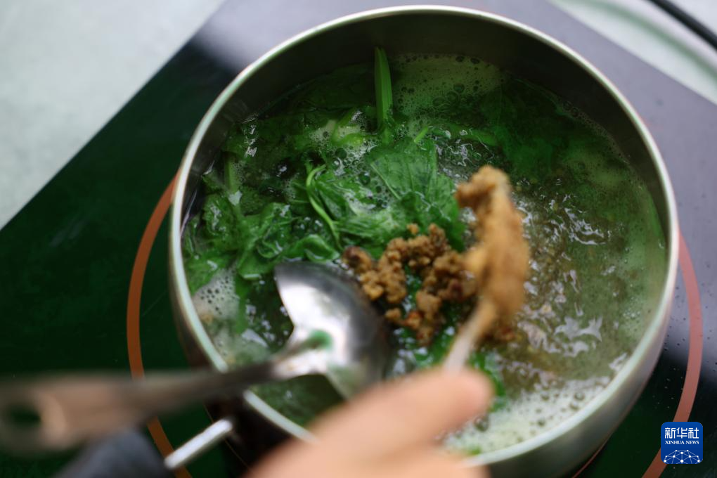 田河村村民杨丽在自家的院子里为游客煮当地特色饮品罐罐茶(7月15日摄)。新华社记者 陈斌 摄