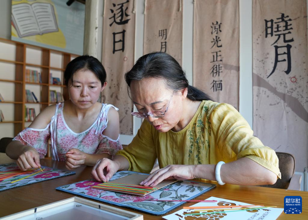 田河村“银杏梦谷”民宿的工作人员张小青(右)和满娟在村里的非遗传承体验中心制作竹编文创产品(7月15日摄)。新华社记者 马宁 摄