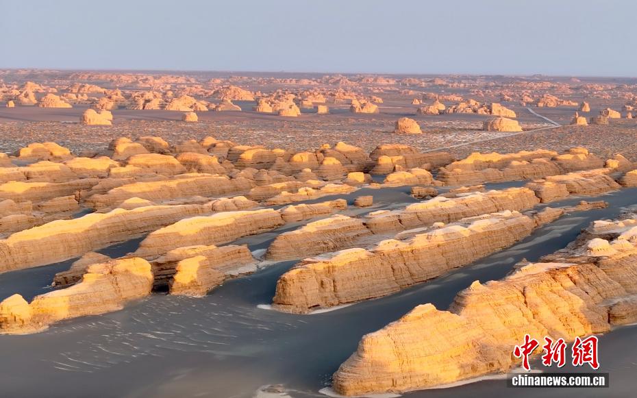 “横看成岭侧成峰,远近高低各不同”。22日傍晚,位于敦煌市西北158公里的敦煌世界地质公园雅丹魔鬼城,在夕阳余晖的笼罩下,更显壮观和神奇,大有秘境之感。“雅丹”是维吾尔语,指具有陡壁的小山。在地质学上,雅丹地貌指经长期风蚀,由一系列平行的垄脊和沟槽构成的景观。敦煌雅丹地貌属于古罗布泊的一部分,是迄今为止发现的世界上规模最大、地质形态发育最成熟、最具观赏价值的雅丹地貌群落。2015年9月,敦煌世界地质公园成功入选联合国教科文组织世界地质公园网络名录,成为甘肃省首家、全国第32家、世界第112家世界地质公园。图为航拍下被夕阳“染金”的雅丹景观。