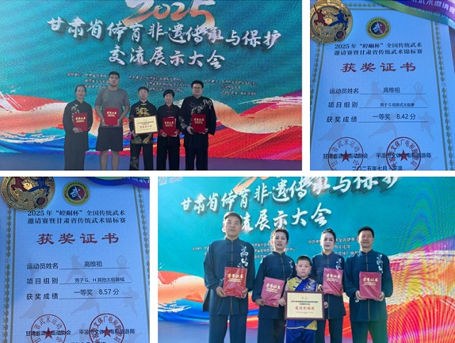 此次比赛高手云集、群英荟萃。比赛过程中,金昌代表队的表演格外引人注目。金川武术传承人高维祖将金昌市级非遗项目金川武术融合传统技法与现代审美进行巧妙编排,以行云流水般的招式,一举夺得“最佳创编奖”。金昌通备八极拳项目则以其刚猛凌厉的拳风、严谨规范的传承体系,赢得评委一致好评,荣获“最佳展示奖”。与此同时,高维祖还应邀参加了同期举行的“2025年‘崆峒杯’全国传统武术邀请赛暨甘肃省传统武术锦标赛”,与全省优秀武术大师同台竞技,互相切磋,在男子G组陈式太极拳和男子G、H组其他太极器械组中均斩获一等奖,勇夺双冠。