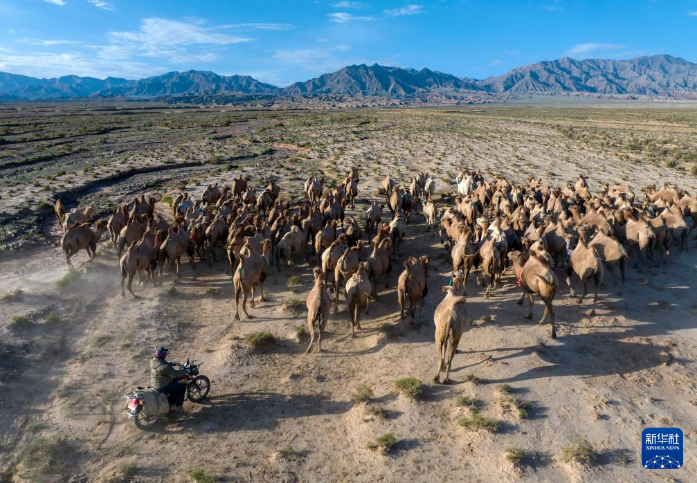 夏日里,甘肃省阿克塞哈萨克族自治县红柳湾镇加尔乌宗村牧民们赶着骆驼,从戈壁滩春季牧场转场到祁连山区的夏季牧场,让骆驼更好生长的同时也让牧场环境得到休养生息。