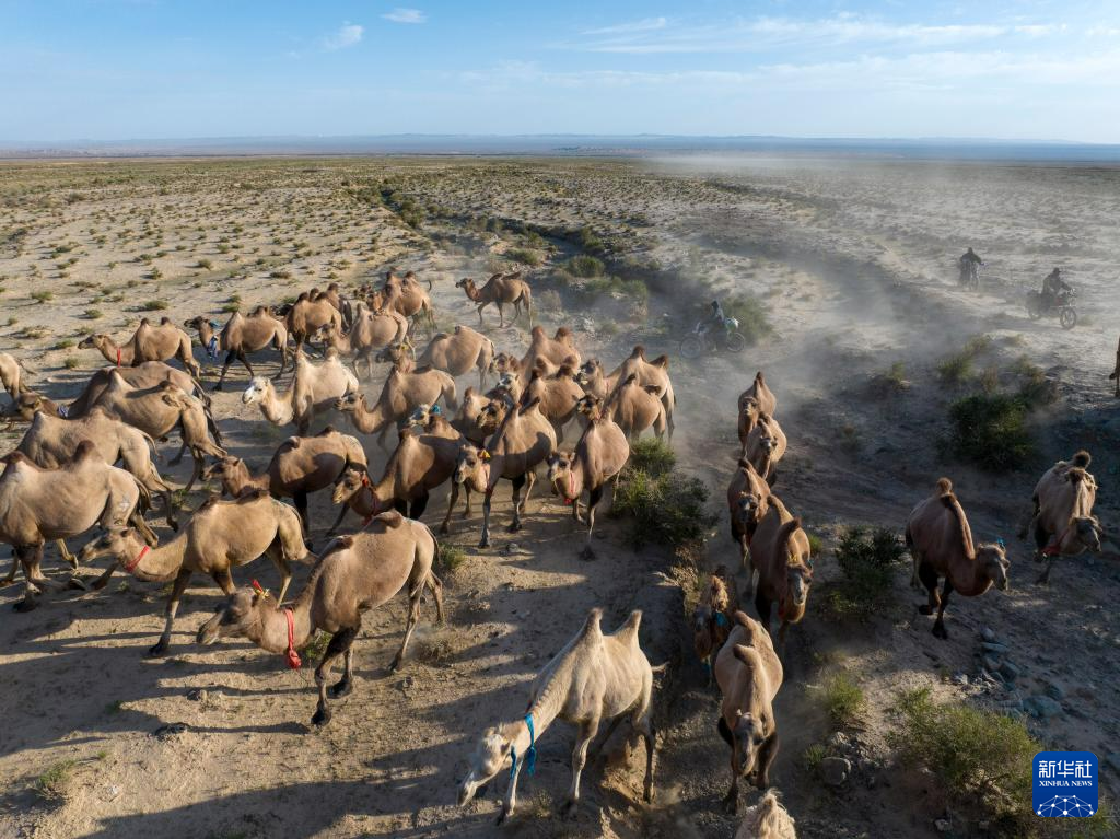 7月26日,牧民赶着成群的骆驼转场(无人机照片)。新华社发(高宏善 摄)