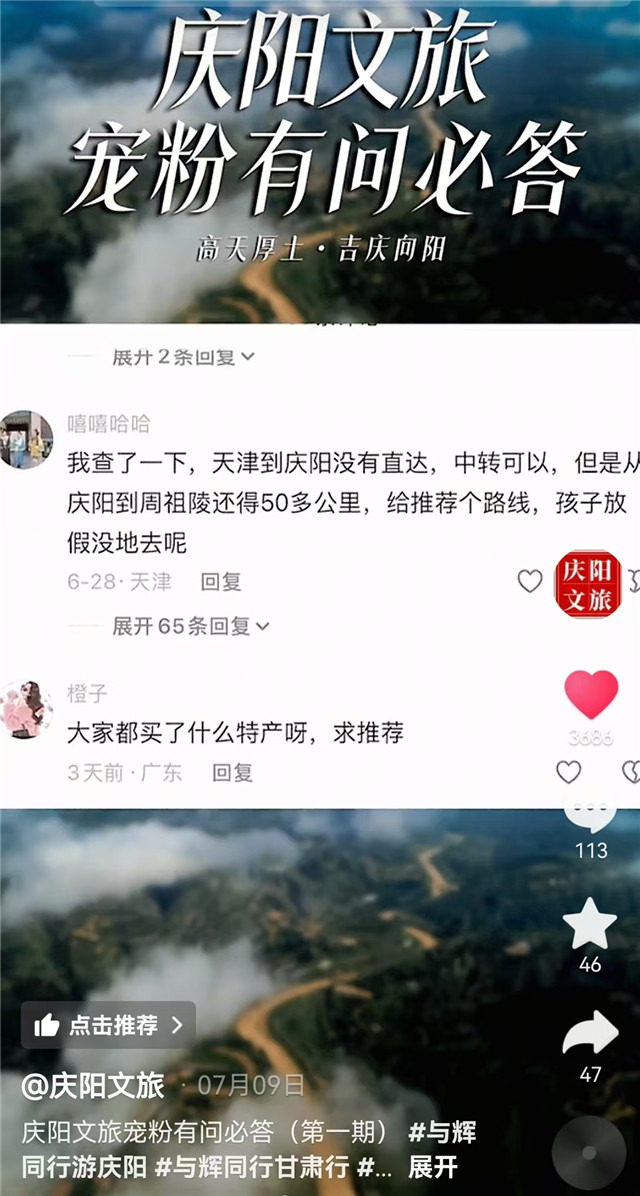 紧盯热点开展线上营销宣传,让庆阳文旅在线上吸引更多流量。围绕“哪吒热”“AI视频”“夏季高温”等网络热点话题,及时制作各类创意视频,不断提升庆阳文旅网络曝光度。“与辉同行阅山河”甘肃宣传推广(庆阳站)活动期间,借助网络超级IP加大线上宣传,通过主动策划场景,着眼平台特点编发宣传视频,直播活动共吸引近3000万人次在线观看。活动期间“与辉同行”官方号、如意甘肃、庆阳文旅、庆阳融媒等新媒体平台发布视频400多部,部分自媒体博主自发跟进发布视频200多部,全网点赞1000多万次,相关话题阅读量超5亿次,并荣登抖音种草榜与抖音上升热点,庆阳直播活动获得网络无数好评,品牌知名度明显提升。