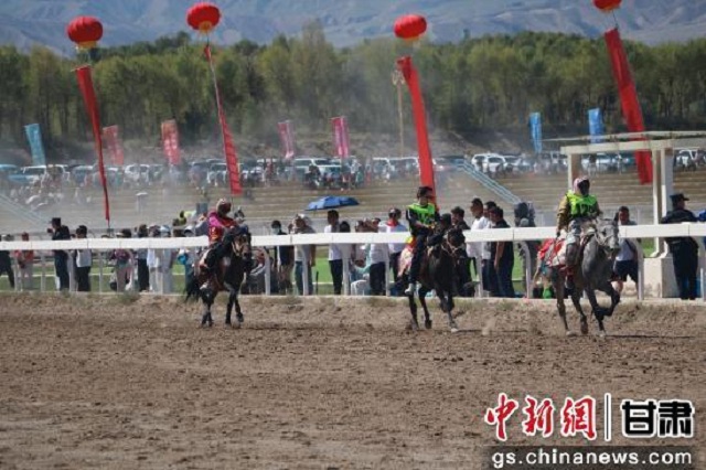 8月8日,2025年肃北蒙古族自治县那达慕开幕。图为赛马比赛现场。张娅妮 摄