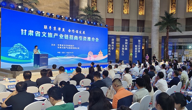 为深化区域文旅产业协作,精准对接京津冀地区优质企业资源,8月27日,由甘肃省文化和旅游厅、甘肃文旅产业集团有限公司主办的“联手京津冀 合作谋发展”甘肃省文旅资源产业链招商引资推介会在北京市举行。甘肃省文化和旅游厅党组书记、厅长何效祖,北京市文化和旅游局二级巡视员张军,中信银行总行政府与机构客户部副总经理张春中,北京甘肃企业商会会长陈玫辛出席活动并分别致辞,甘肃省文化和旅游厅党组成员、副厅长李殿俊主持政务环节。甘肃省驻京办事处党委委员、副主任杜晓燕,中青旅控股股份有限公司党委书记、董事长倪阳平等出席推介会。