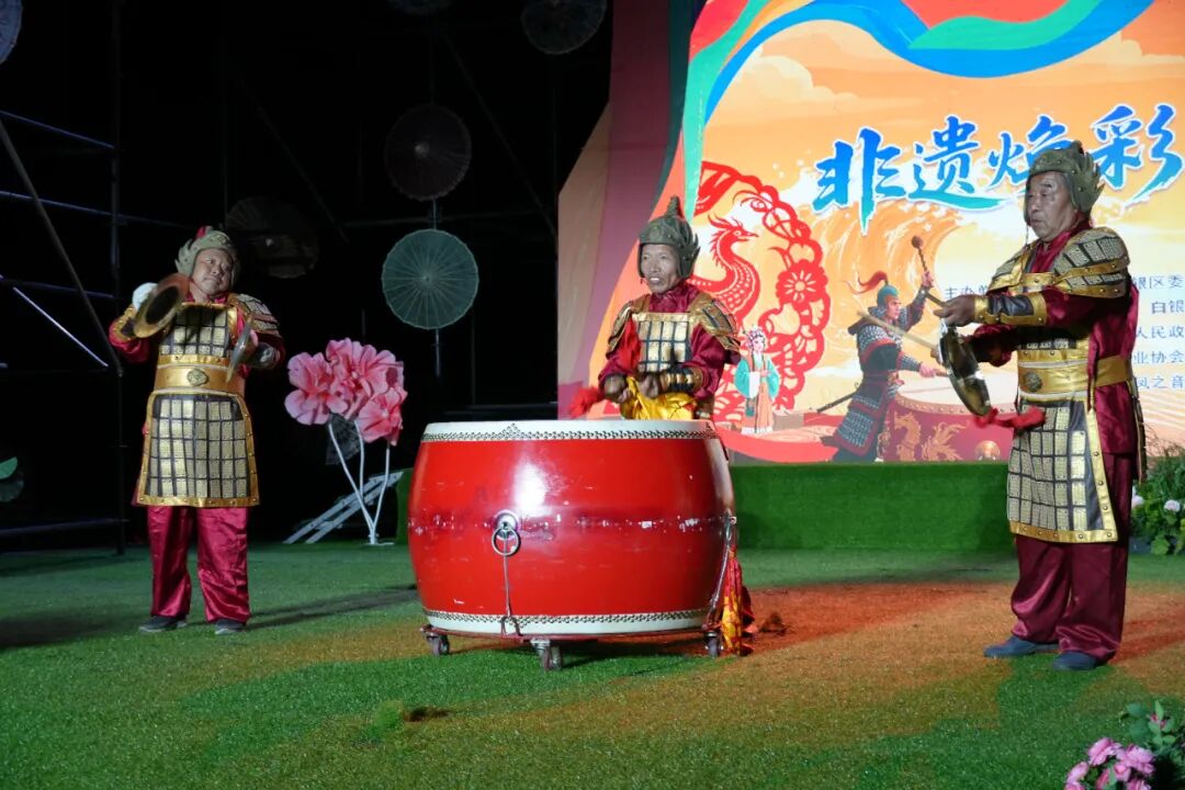 夜幕降临,“非遗焕彩•铜城之光”文艺演出精彩上演,吸引了众多游客和周边村民驻足观看。女声小合唱《千年古渡》、非遗秀《剪影霓裳》、曲子戏歌《古地新曲》、情景朗诵《锻火成铭铜艺风华》《非遗里的铜城》等十余个节目轮番登场,以多元艺术形式,生动演绎了铜城非遗的底蕴,让现场观众见证了非遗在创新中焕发出的时代生命力。演出过程中,省级非遗黄河战鼓震撼亮相,激昂的鼓点、磅礴的气势瞬间点燃全场,将现场气氛推向高潮。