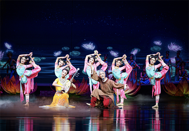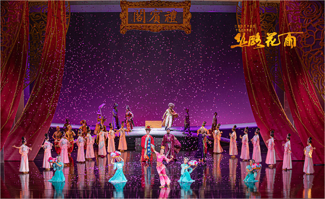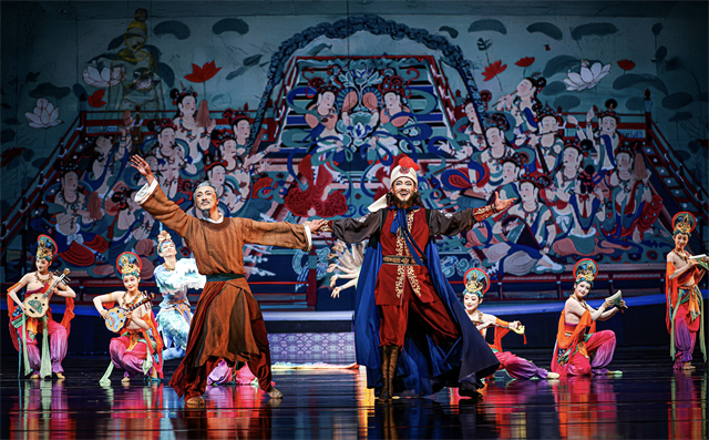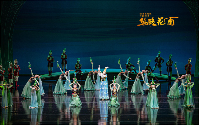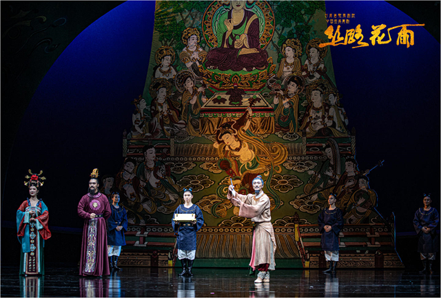 不忘本来、吸收外来、面向未来,舞剧《丝路花雨》的创造性转化、创新性发展从未停止。在时代发展的浪潮中,《丝路花雨》几经改版修排提升,不断升级换代、常演常新,展现出经典的无穷魅力,特别是在2008年和2016年,这部作品经过了两次大的改版,在满足观众审美需求变化的同时,不断以新的姿态持续焕发生机。此次在敦煌文博会舞台上呈现的舞剧《丝路花雨》新版,历时2年综合提升,既复原了79版凭栏仙女、莲花童子等经典舞段,更通过现代舞蹈理念升级情感表达,强化单双三舞蹈编排,配合精准的光影控制、多媒体投影技术,实现了“科技+美学”的破壁创新,在保留经典基因的基础上,实现了“传统与当代”的双向奔赴。当全息投影将莫高窟壁画在舞台上缓缓展开,当驼铃声与电子乐编曲交织出跨越时空的和弦,观众相信,所谓“传统”从不是凝固的标本,而是流动的生命,正如剧中穿越千年的花雨,落在古代画工的笔端,落在当代舞者的袖间,浸润海内外每一位观演者的心田。剧中描绘的中外友好通商、民心交融场景,更是对新时代“一带一路”倡议的生动诠释。