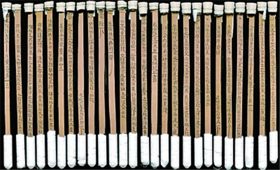 王杖诏书令册简,1981年出土于武威磨嘴子汉墓群18号墓,年代为公元前10年(汉成帝时期)。简文全书总计27枚,除第15简缺失,其余26简首尾俱全,上面墨书的汉隶至今清晰可见。王杖诏书令册简内容丰富,其中有“年七十授王杖”的记载。拥有王杖的老人拥有特权,可以自由出入官府不跪拜;从事商业经营免于征税;路上行人见持王杖者要让道,等等。