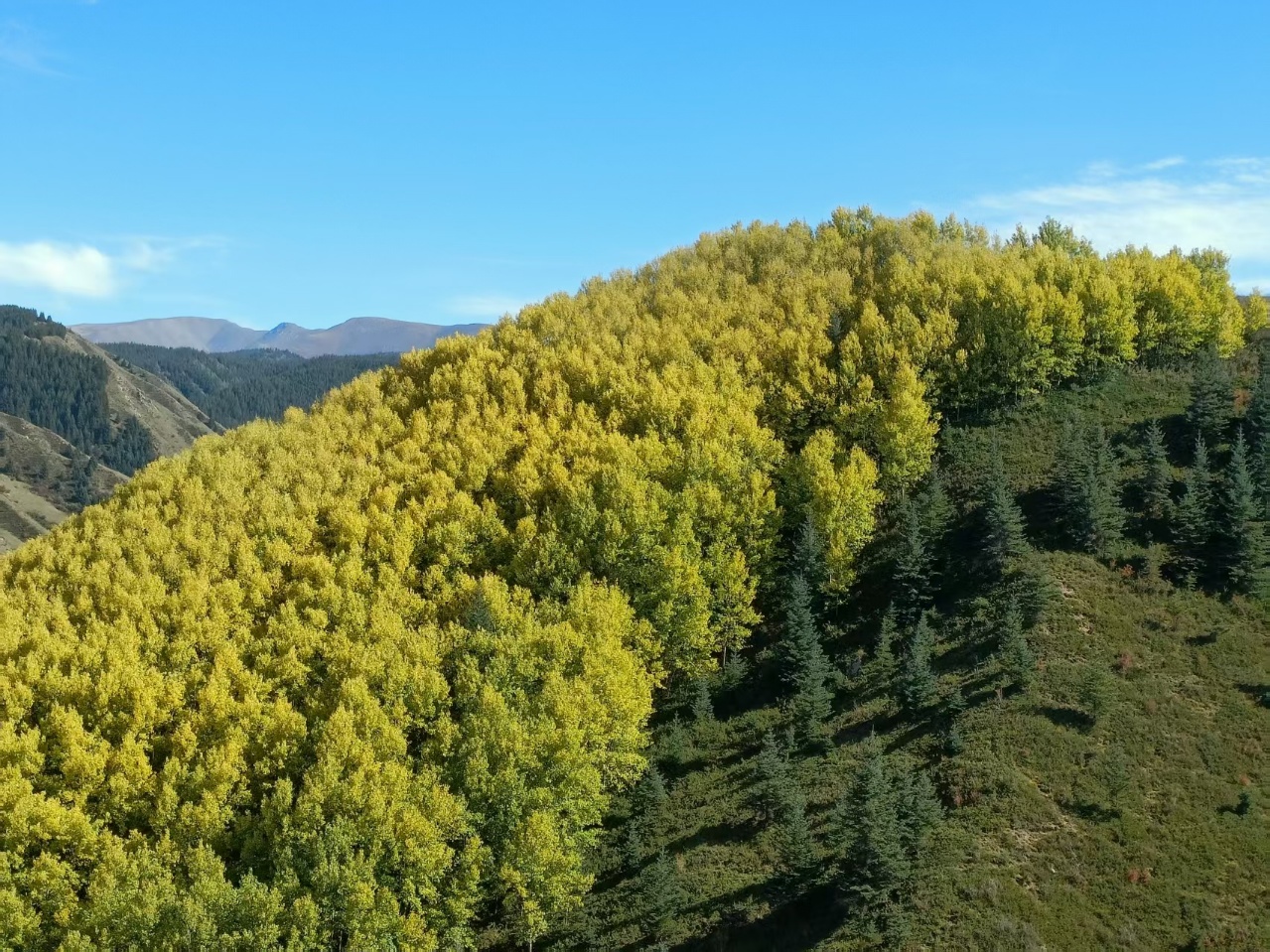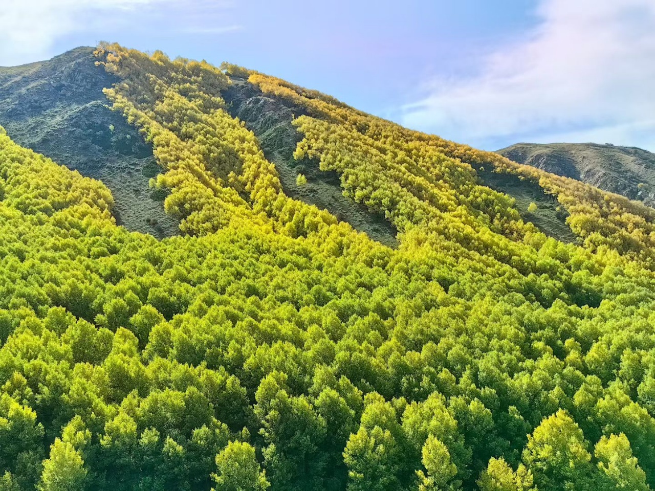 秋天,焉支山林间树木披上金黄,宛若身披“黄金甲”,在阳光下熠熠生辉。