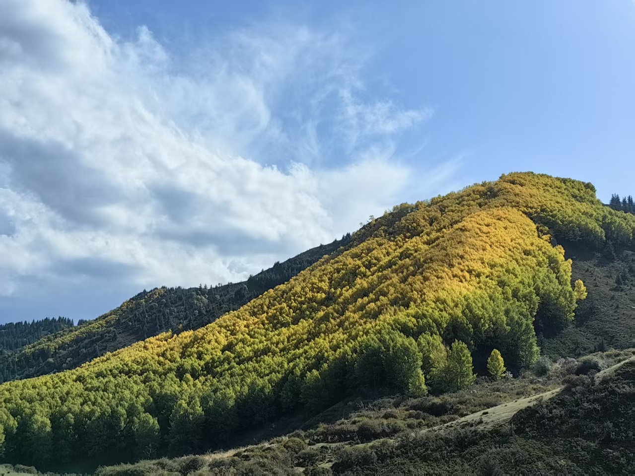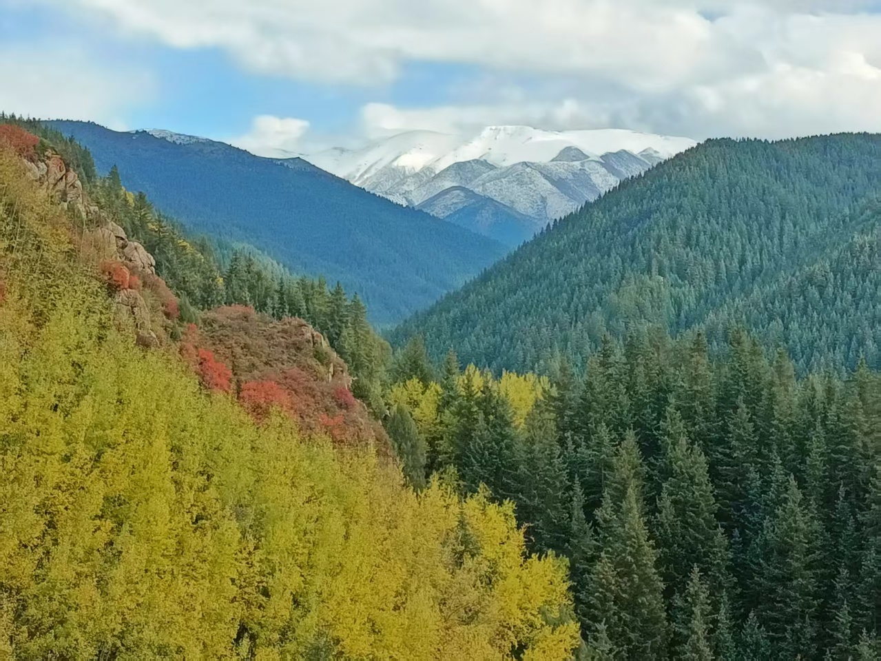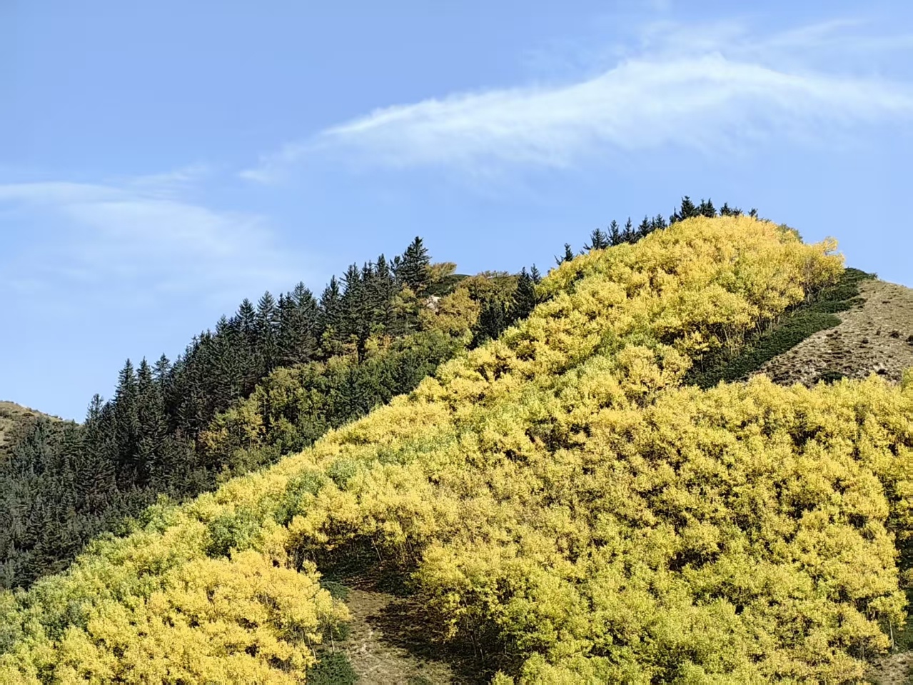 秋风吹过,焉支山的原始森林悄然换装。黄绿交织,红金点染,仿佛大自然执笔挥洒的油画,静谧而热烈。