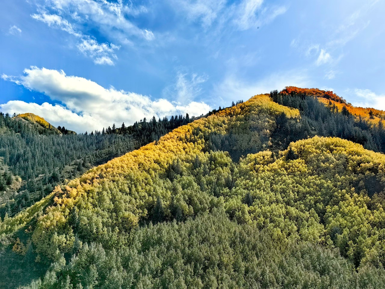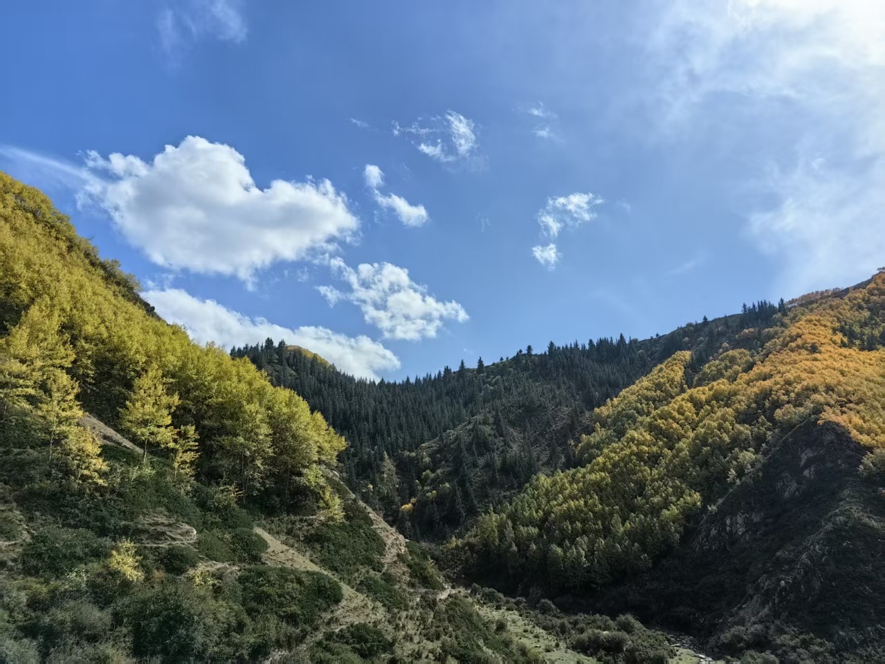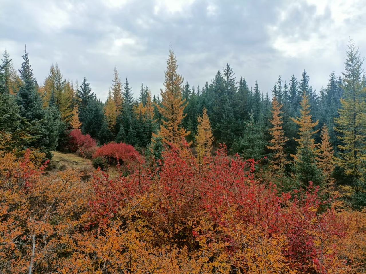 秋风吹过,焉支山的原始森林悄然换装。黄绿交织,红金点染,仿佛大自然执笔挥洒的油画,静谧而热烈。