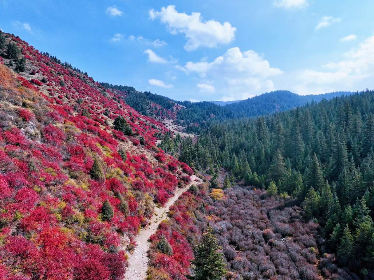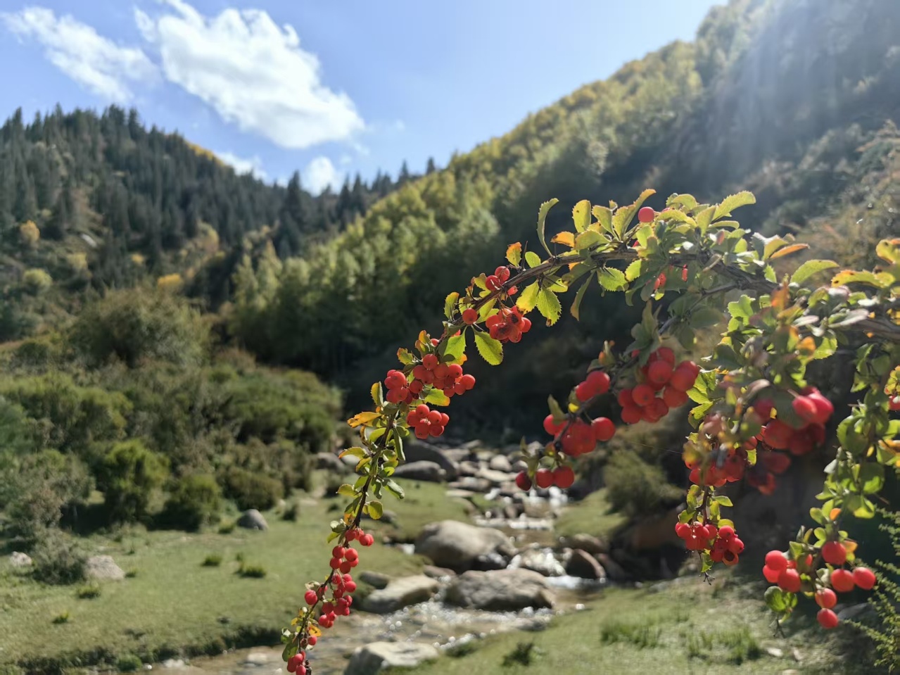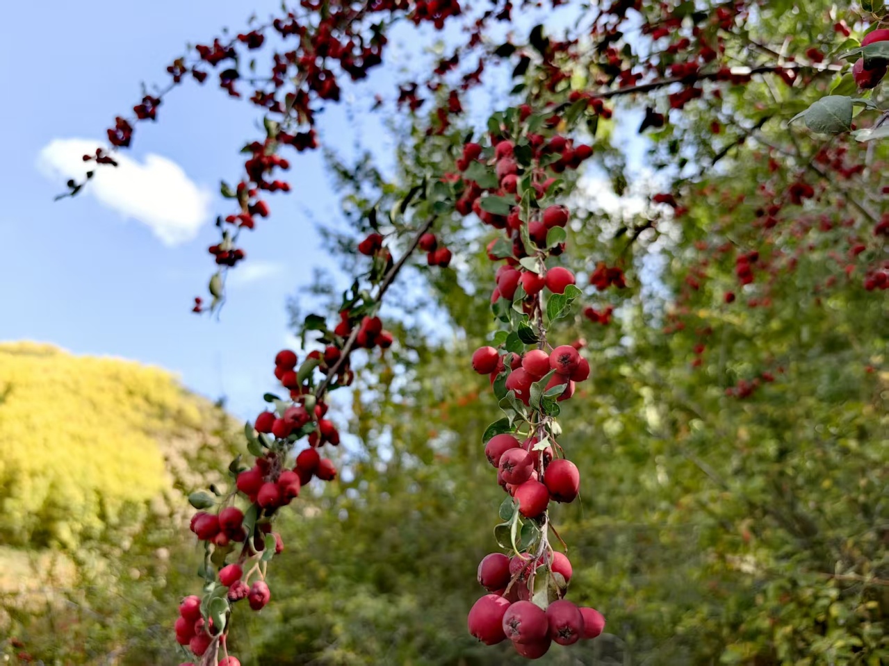 秋天,焉支山火红的沙棘果点缀于绿意之中,像是散落在山野的宝石,点亮了整个山谷。